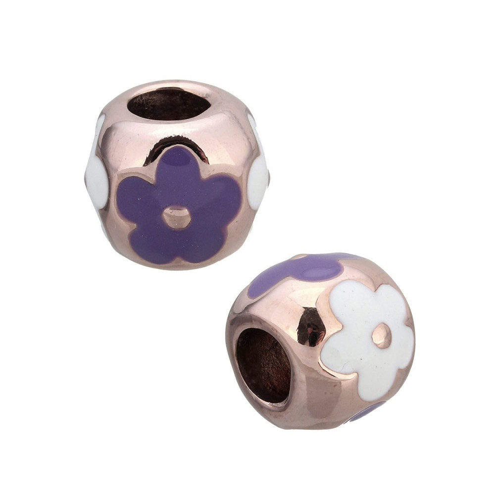 Korálek v galvanizaci Rose Gold a fialovou emailovou kytičkou z chirurgické oceli