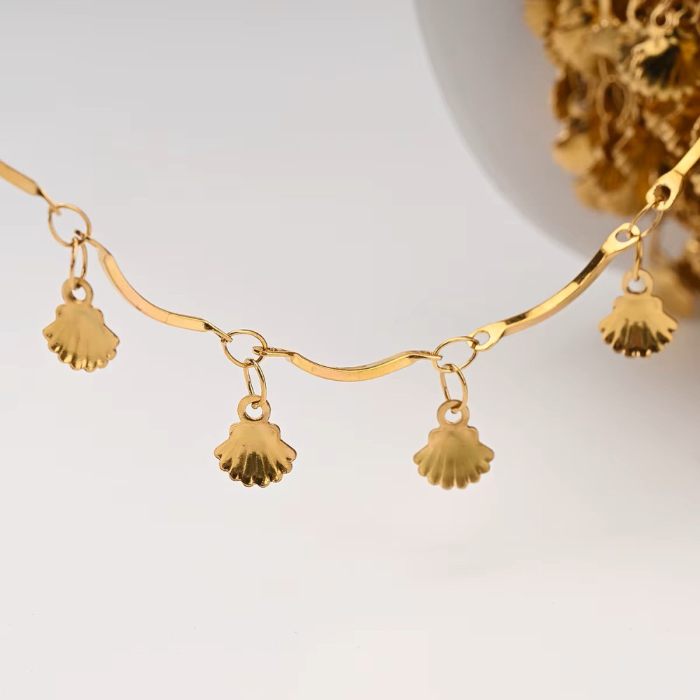 Dekorativní řetízkovina s konektory a jemnými mušlovými přívěsky z nerezové oceli 304. Ideální pro výrobu originálních náhrdelníků, náramků i moderních šperků.