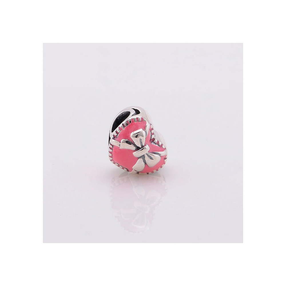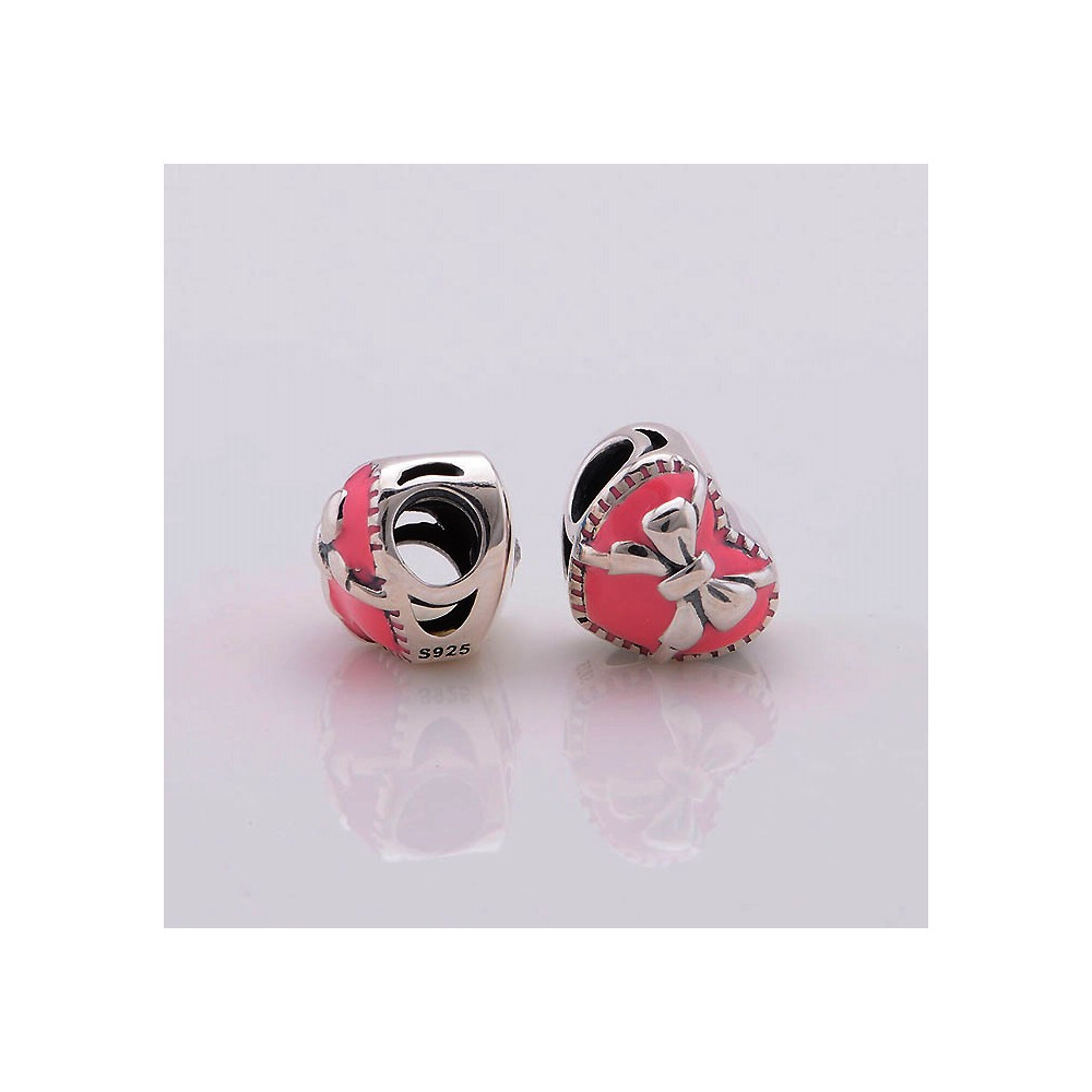 the bead has a pink bow on one side and a blue heart with zircon on the other