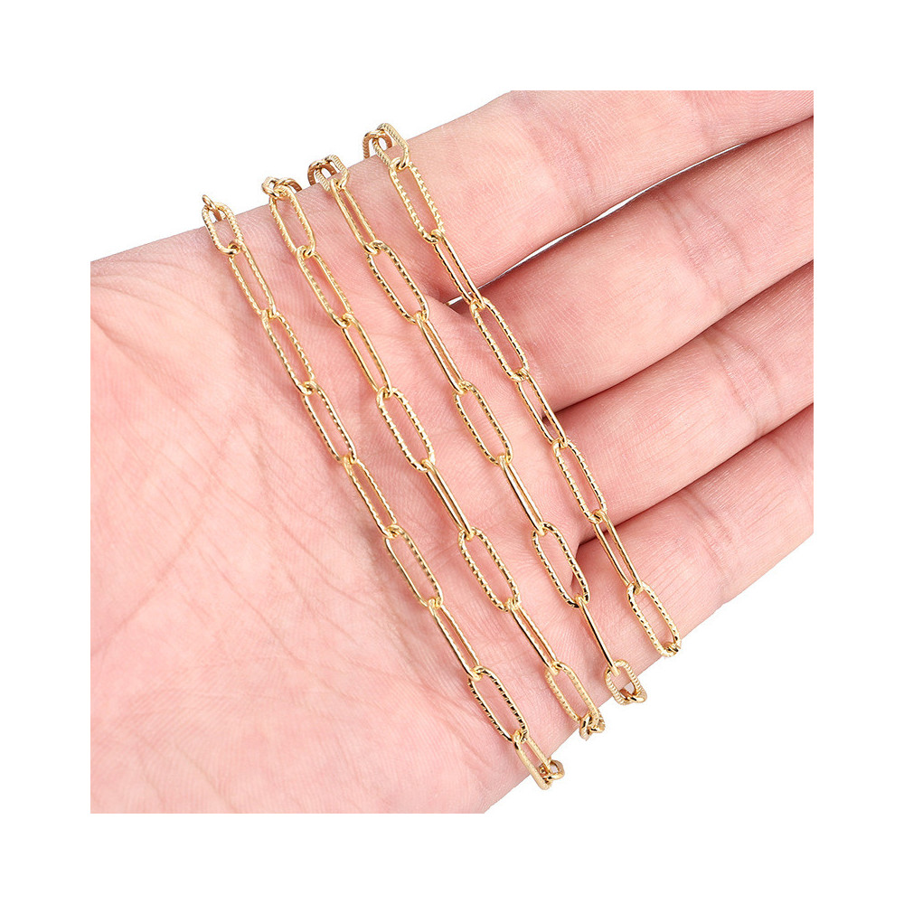 This modern chain features elongated oval links with a fine ridged surface, adding extra sparkle and detail to minimalist and statement jewelry designs.