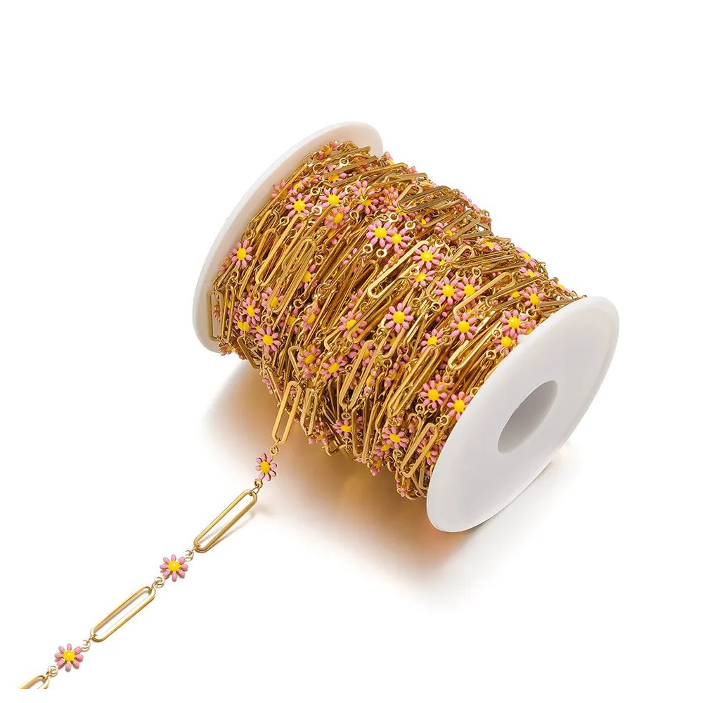 Decorative paperclip chain fabric featuring small colorful enamel flower links in several variations.