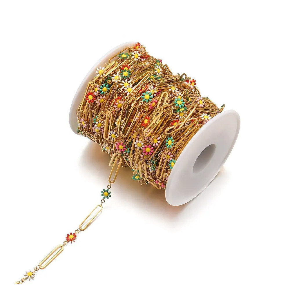 Decorative paperclip chain fabric featuring small colorful enamel flower links in several variations.
