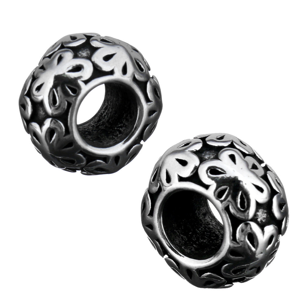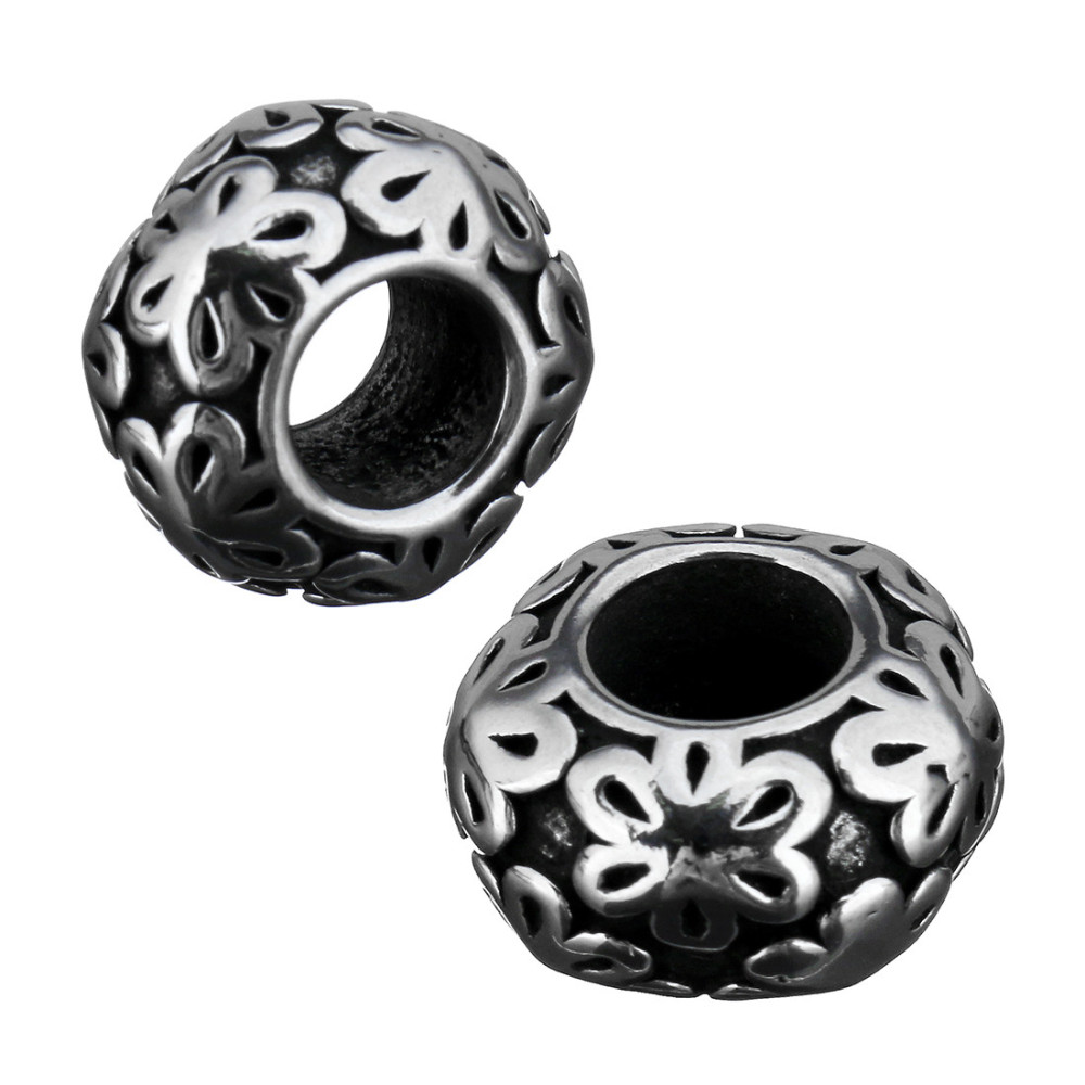 Bead with flowers in antique silver patina of surgical steel