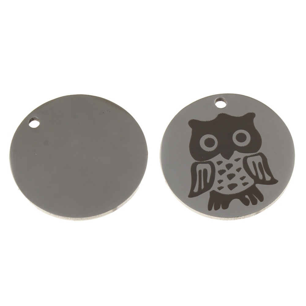 Round pendant with engraved owl in the middle of surgical steel